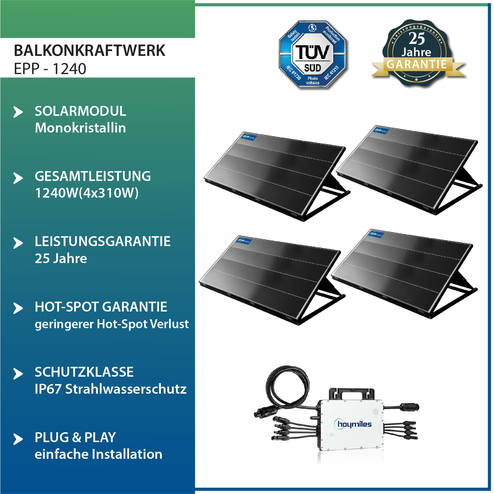 Solar PV 1240W Balkonkraftwerk Komplettset- Mit Easy peak Power 310W Solarmodule und Hoymiles 1500 mikrowechselrichter